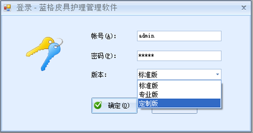 第三、运行软件后输入账号:admin,密码:admin,选择需要试用的版本。点击确定就可以开始使用蓝格皮具管理软件了。