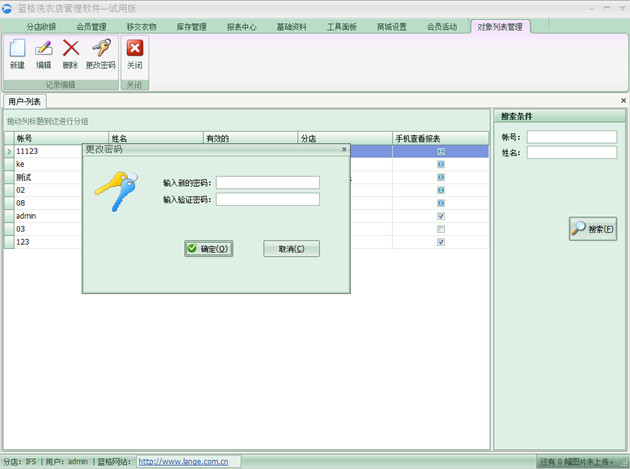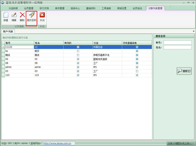 点击【基础资料】-【用户管理】,点击【更改密码】,如图: